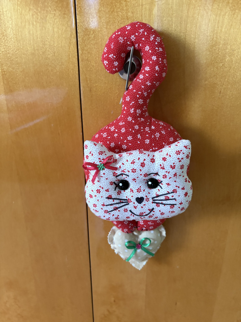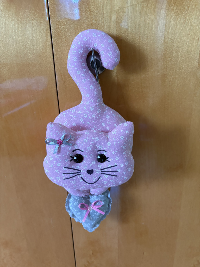 Roztomilá textilní dekorace ve tvaru kočičky, která okouzlí svým milým úsměvem a jemnými detaily. Kočička má praktické poutko ve tvaru háčku, díky kterému ji snadno zavěsíte na kliku dveří, skříň nebo zeď. Rozměr 20 cm x 10 cm.