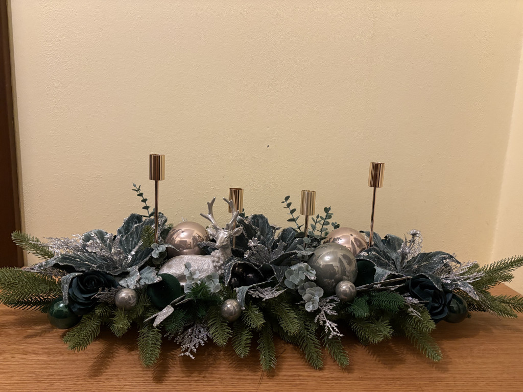 Tento elegantní sváteční svícen vnese do vašeho domova kouzelnou atmosféru Vánoc. Působí slavnostně a zároveň noblesně. Hodí se jako dominantní dekorace na stůl, komodu či sváteční stůl během adventu i vánočních svátků. Ručně vyráběná dekorace. Rozměr 60 cm x 25 cm