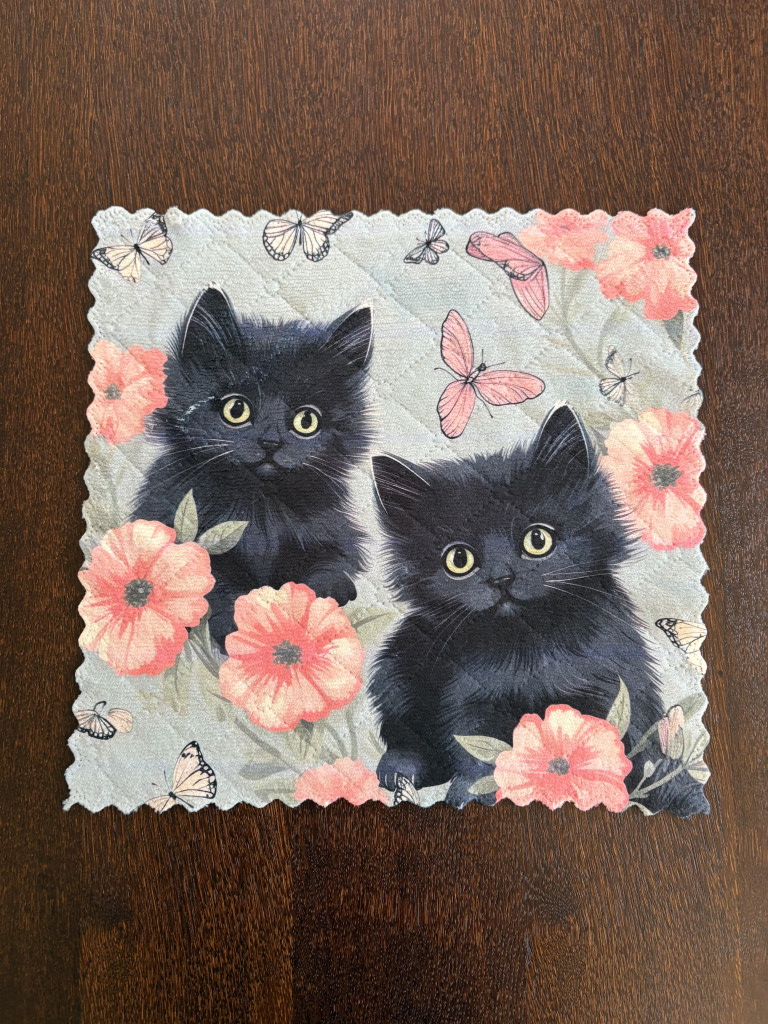 Roztomilé prostírání s krásným motivem černých koťat. 30 cm x 30 cm.