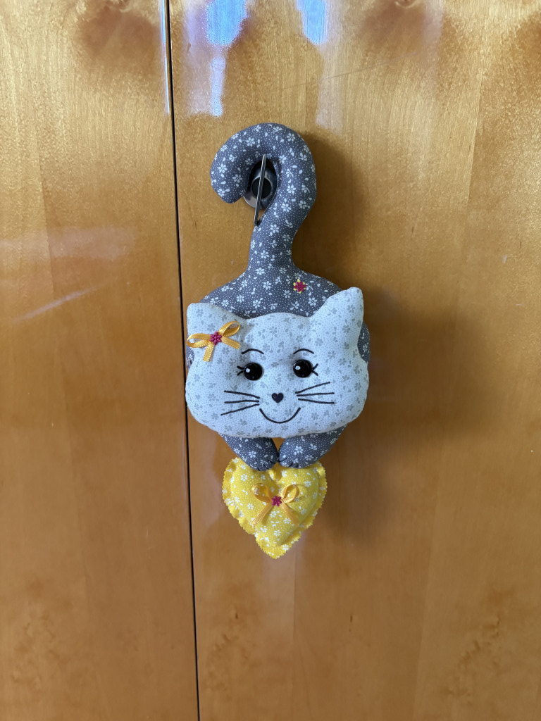 Roztomilá textilní dekorace ve tvaru kočičky, která okouzlí svým milým úsměvem a jemnými detaily. Kočička má praktické poutko ve tvaru háčku, díky kterému ji snadno zavěsíte na kliku dveří, skříň nebo zeď. Rozměr 20 cm x 10 cm.